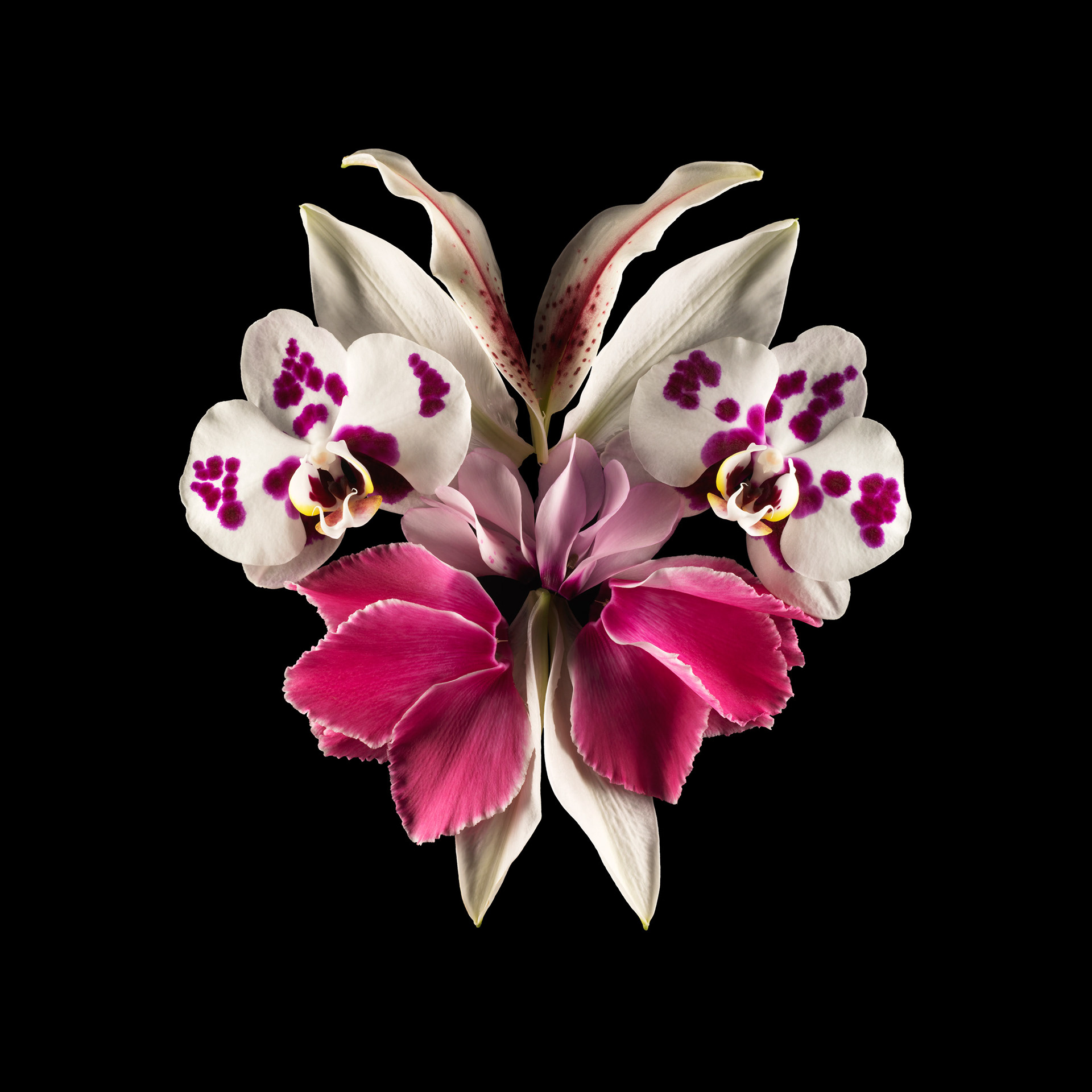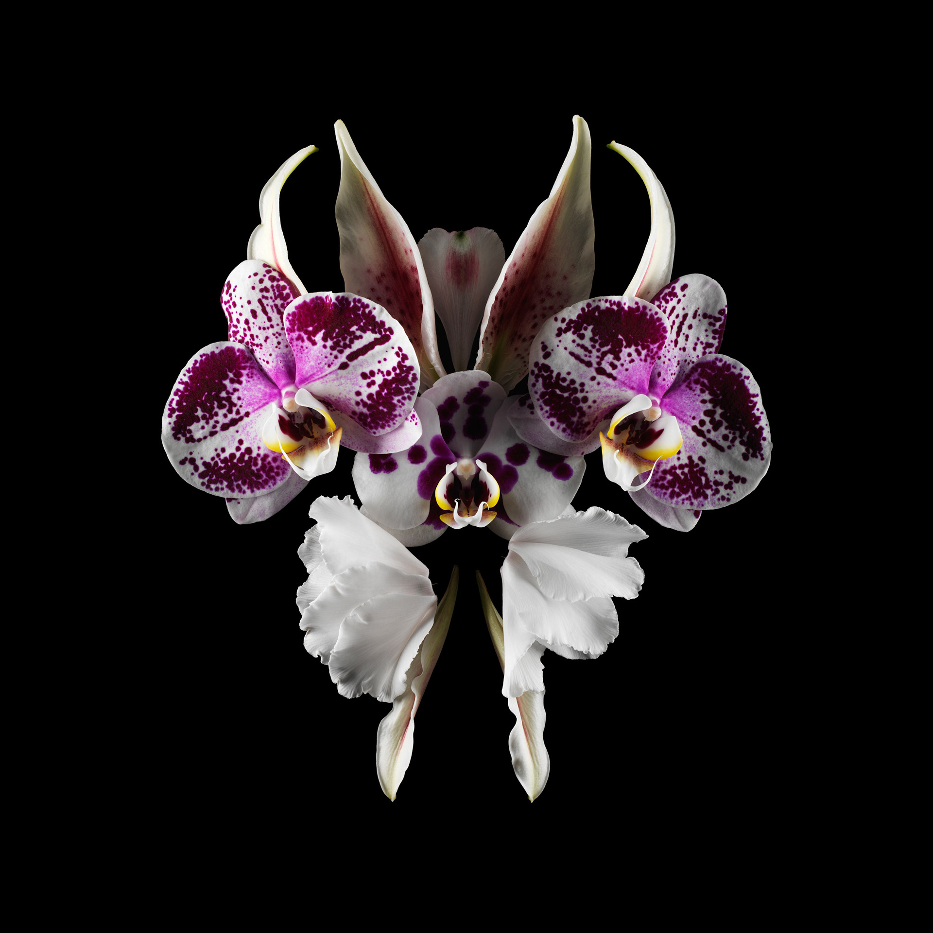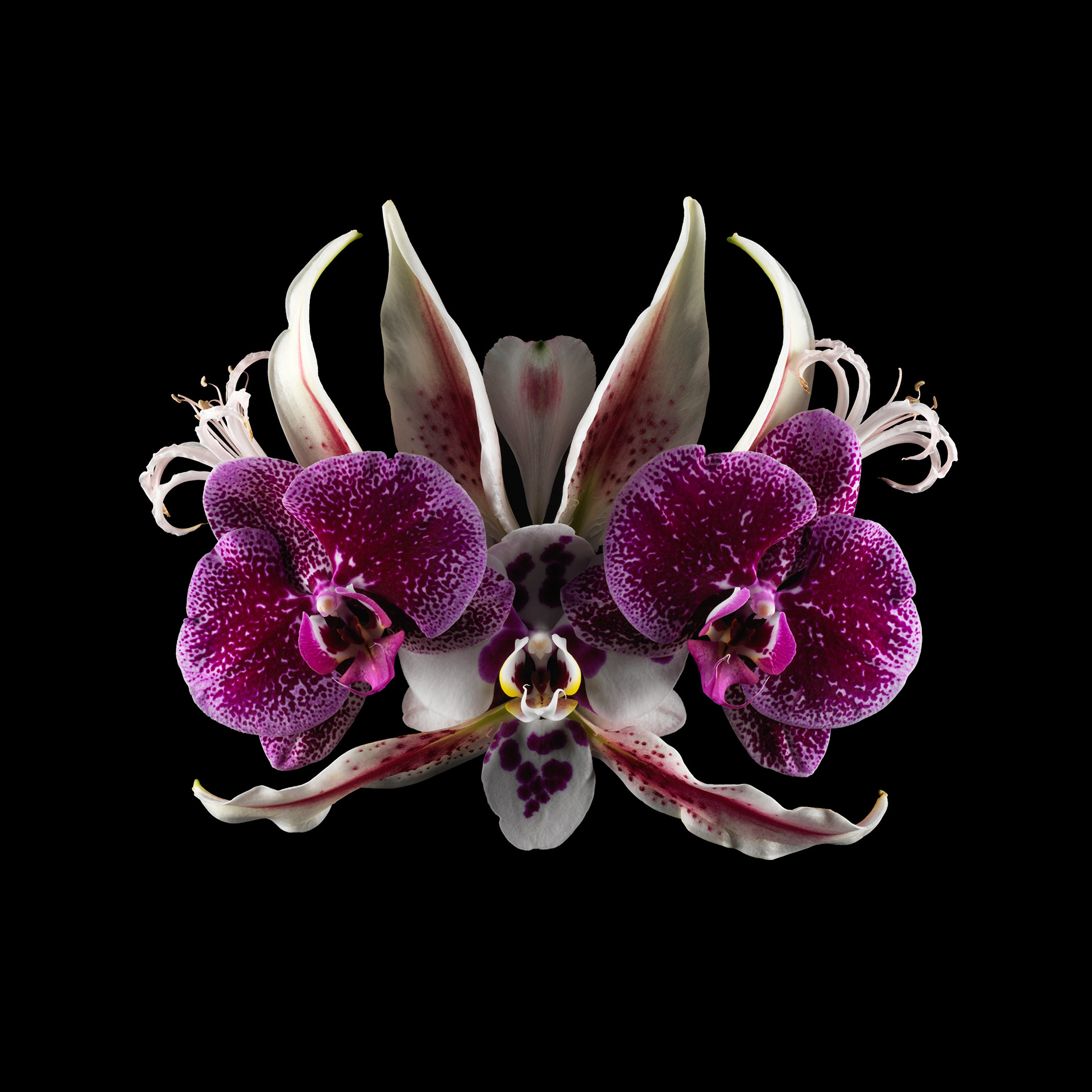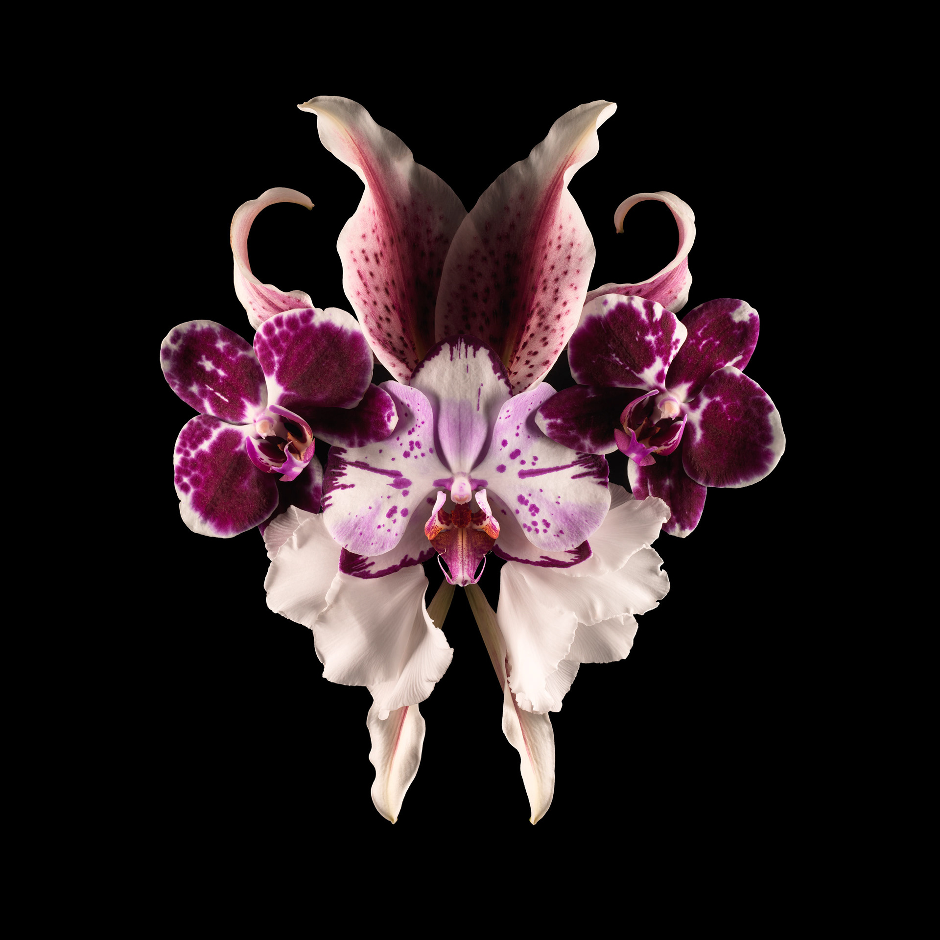 Ces fleurs, assemblées en compositions volontairement asymétriques, suggèrent des visages d’un autre monde, surgis de la lumière et du velours nocturne.