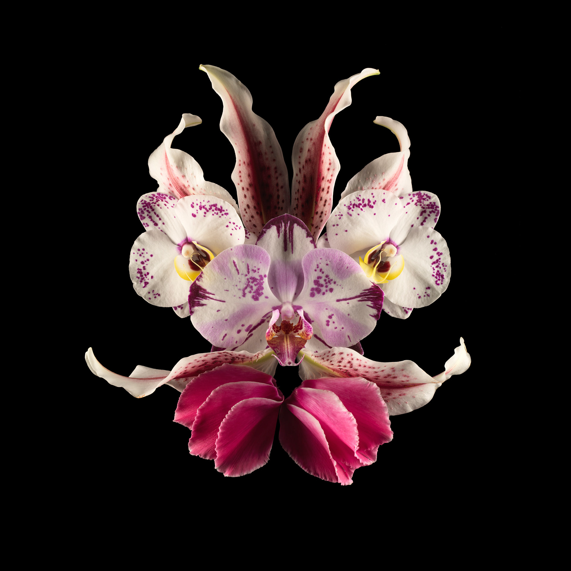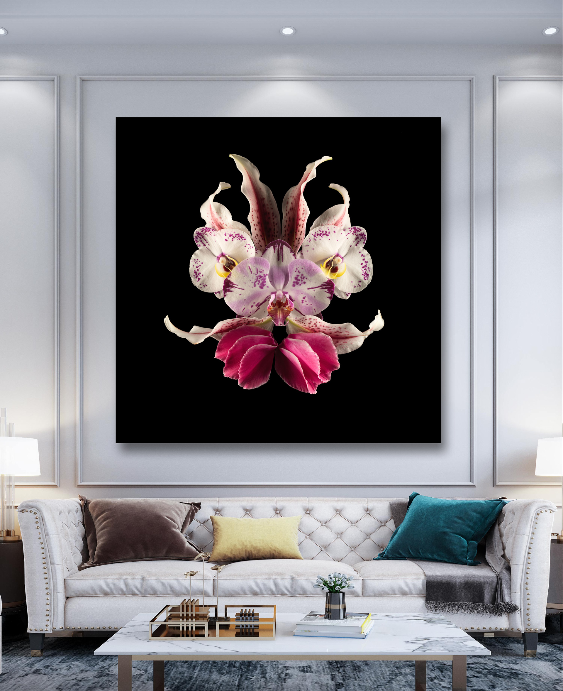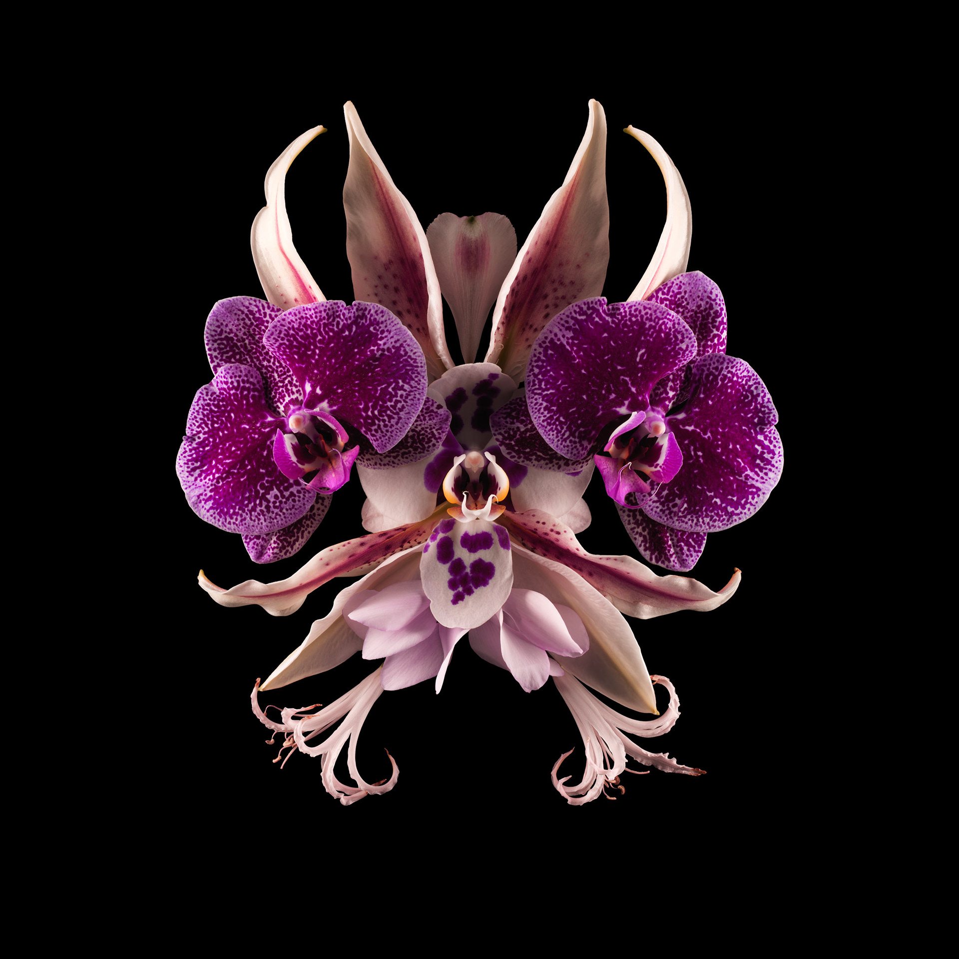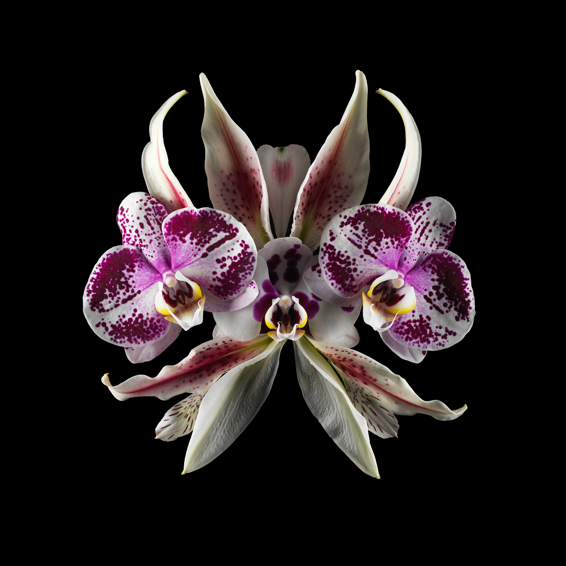 Ces fleurs, assemblées en compositions volontairement asymétriques, suggèrent des visages d’un autre monde, surgis de la lumière et du velours nocturne.