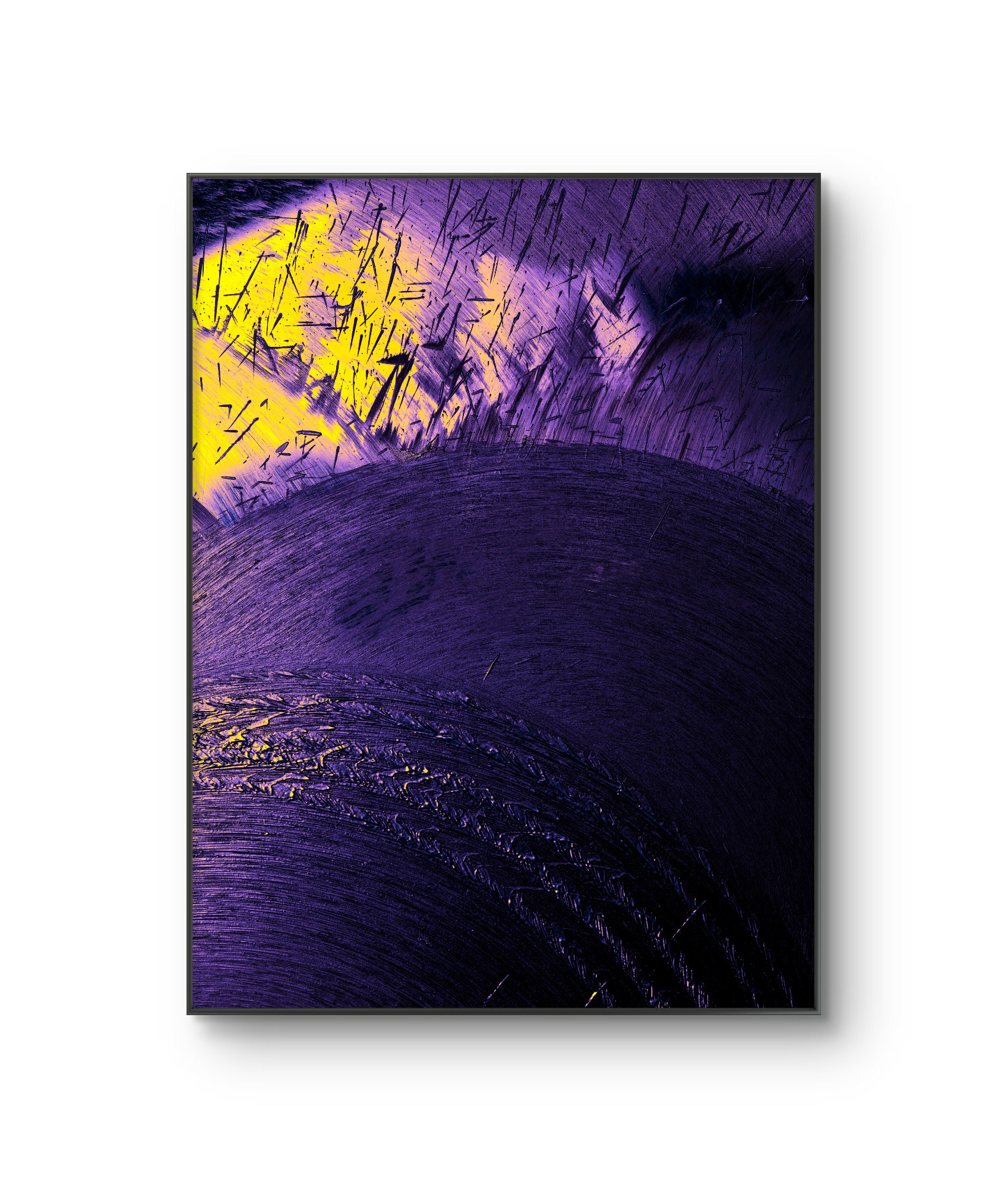 Cette œuvre révèle une danse dynamique entre des violets profonds et des jaunes vibrants, créant une atmosphère mystérieuse et intrigante.